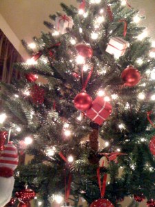 Even this week, when things were hectic at work and I STILL did not get a chance to buy stamps, there it was twinkling from the window, like it had been looking down the street waiting for me to come home…tall and sparkly, pretty and happy. It’s close enough to the computer that when I sit down to return emails, or figure out what I want to write about, I usually end up turned in my seat gazing into my fun house mirror reflection on one of the shiny red ornaments. And then of course, I wince when I realize Jacob does this, and I tell him to turn around and focus.