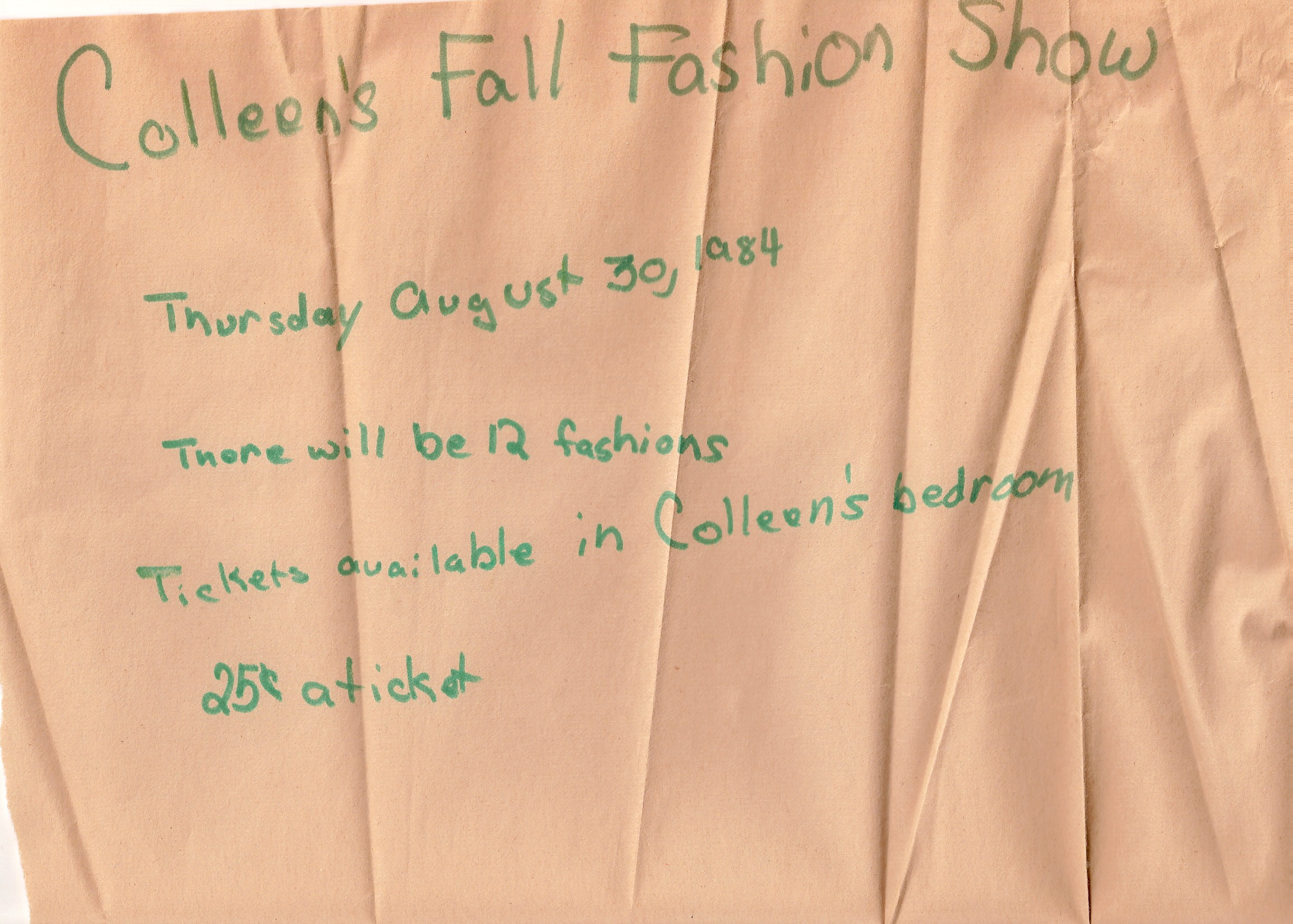 I know I’m the one who wrote it, but I love it. I like to picture freckled little 10-year-old Colleen earnestly creating 12 fashions, and making this sign, and then going ahead and charging mom and dad a quarter….each (sorry, no friends and family discount). Think back to your little kid self, and the stuff you did. You were figuring it out, shaping yourself for what was to come. There we were, the kiddo versions of us, trying out all kinds of careers, just by playing. Sure, you may not have played “analyst” or “consultant” but that’s ok… you might have if you knew those jobs existed and how glamorous they would turn out to be.