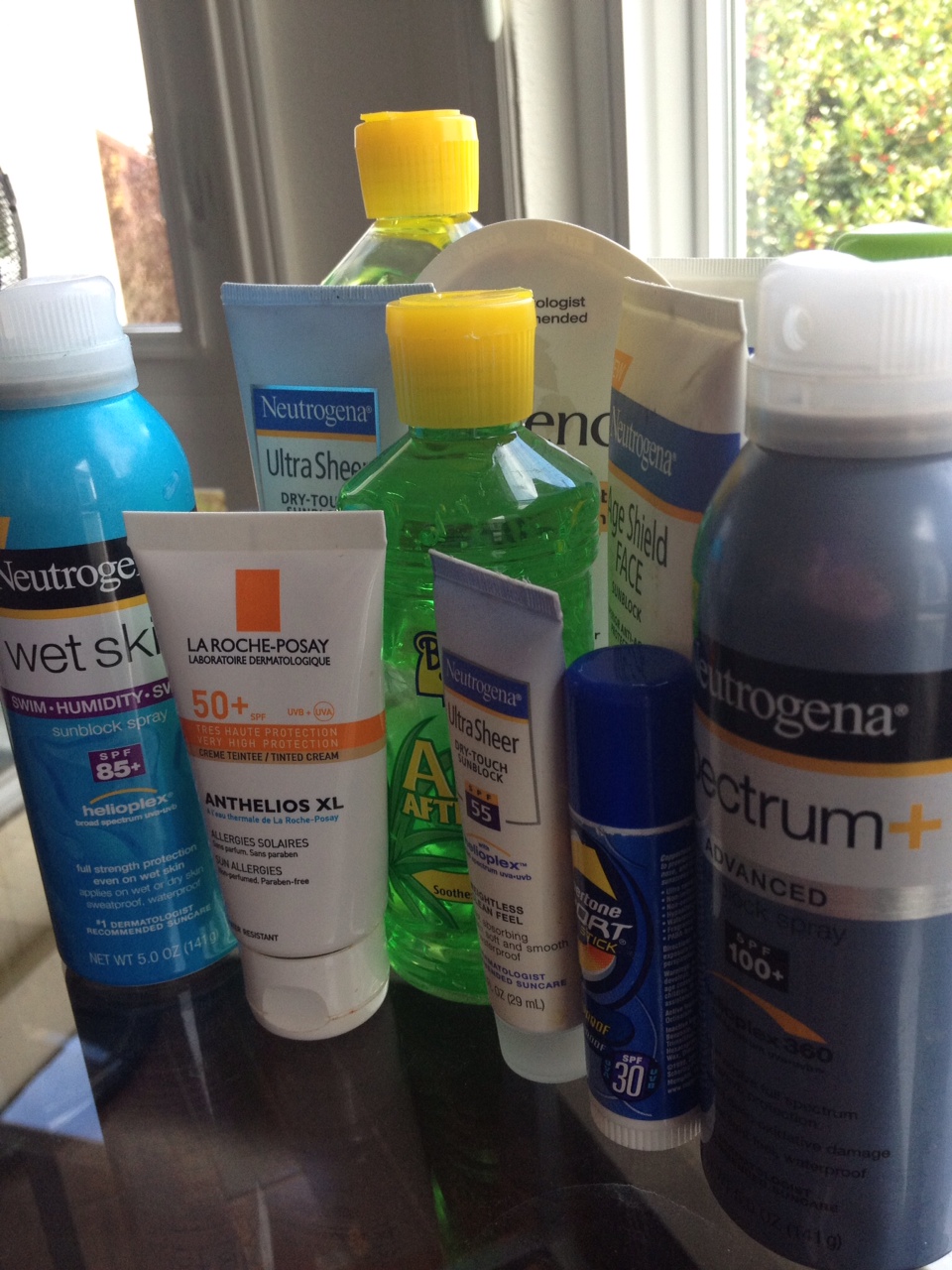 * At the top is our actual sun prevention collection. It is strategically spaced through the house, so that by the time you reach the front door, you will have had three to four opportunities to remember it.